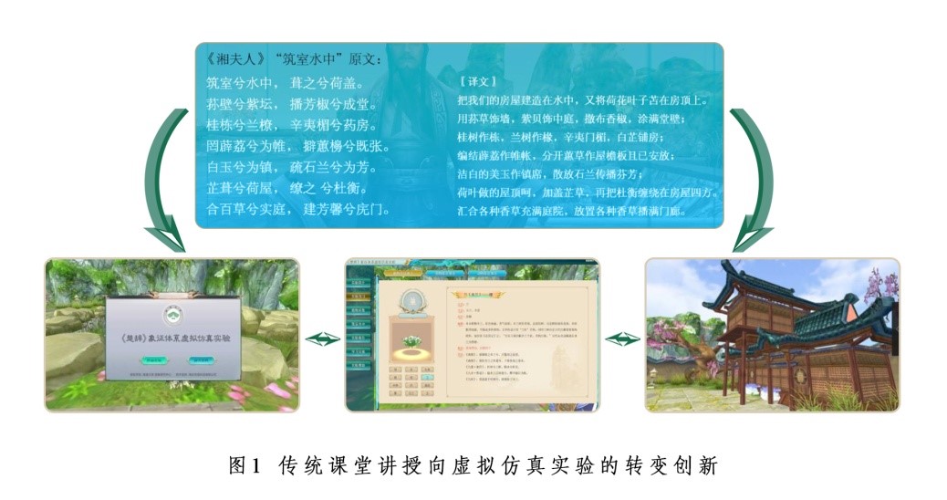 本实验总体目的: 让学生在虚拟仿真教学实验中多识草木、鸟兽、器物之名,掌握《楚辞》象征体系的构建方法和文化寓意,在此基础上把握《楚辞》文学情境,感受中国古典文学的艺术魅力,增强文化自信,涵养高尚的道德情操和爱国情怀,进而提升学生的实践能力、审美能力、文学能力和创新能力,弘扬中国传统文化。 本实验具体目的: (1)通过3D动画和文字阐释,了解植物、器物、动物物象的物质属性,对古代名物进行更直观地把握,学习、把握《楚辞》象征体系。 (2)通过“水室”的搭建,熟悉中国古代建筑的基本结构,增强对古代物质文化的认识,提高学生的综合知识水平。 (3)通过还原楚地风物,古典音乐配音,以诗歌文本、人物肖像、历史图像等背景资料作为参考,学生自觉进入诗歌意境,沉浸式体验《楚辞》所描绘的山川环境、人情风貌,更好地进入诗人屈原的情感世界,感受《楚辞》“惊采绝艳”的文辞和绮靡瑰诡的文学境界。 (4)在教学手段上,实现由传统课堂讲授向虚拟仿真实验的转变创新。在传统讲授中,主要以文本阅读、文字解释、艺术分析、主旨提炼为主,这些都基于教师的“传”与学生的“受”,虚拟仿真实验更注重体现学生“实践”的过程,并为有志于从事教育工作的学生提供良好的课程开发启示。见图1: